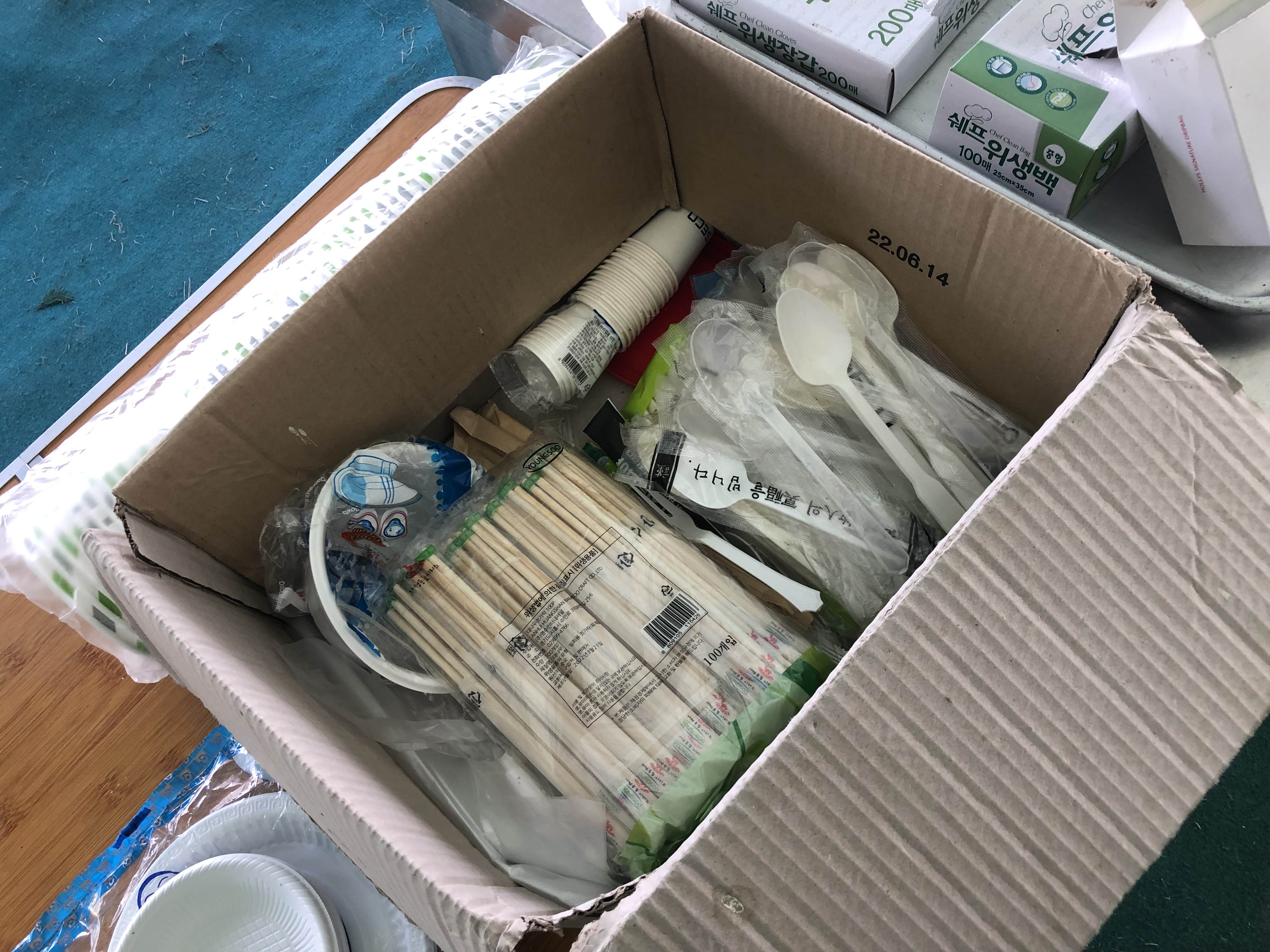 젓가락, 숟가락, 종이컵, 그릇 등의 일회용품도 있다.